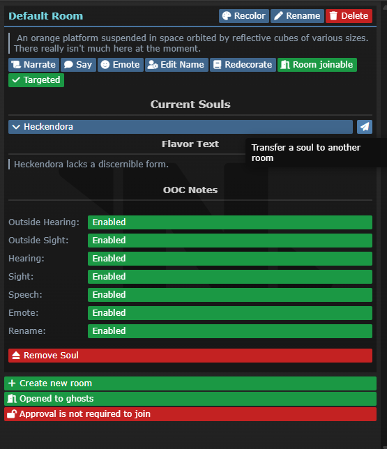 This is the only way for them to ICly speak as the person they used to be. As far as Blackout policy goes, nothing changes. They don't remember what killed them, they don't acknowledge anything they OOCly perceived while being a floaty ghost observer. It as if you had revived them on the spot... except their physical body's still kind of dead at the moment. When you do revive them, as long as they're basically revived instantly, they may remember what they have perceived from inside your soulcatcher, including your conversation. Blackout policywise, it is no different than reviving someone, then dragging them into another room. Like, if you eject someone from your soulcatcher then take another 20 minutes to revive them, they clearly remember nothing from when they were OOCly a floating ghost, but they might still remember the conversation and stuff from inside the Soulcatcher. TODO: yeah this section is a mess.